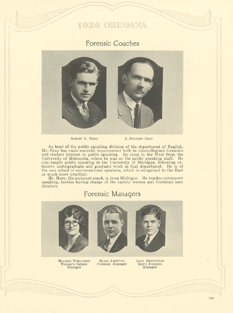 By the mid-1920s, Oregon Forensics had grown into a structured and professionalized program. For the first time, the Oregana yearbook highlighted the important role of forensic coaches and student managers, reflecting the maturity of the program and its significance on campus.