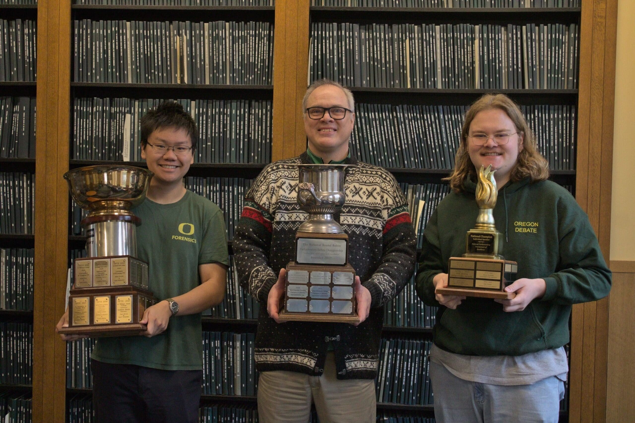 (Photo: Oregon debaters Alex and Gabe with their coach, holding the NPTE, Round Robin, and Top Speaker trophies, 2022).