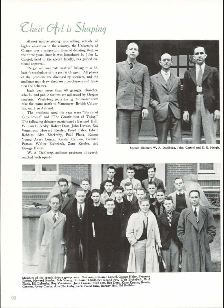 Under the leadership of Professor John Casteel and colleagues like W.A. Dahlberg, symposium teams toured throughout Oregon and the Pacific Northwest, speaking before Rotary clubs, Grange halls, churches, and high schools. More than 40 audiences were addressed each year, and the topics — such as “Forms of Government” and “The Constitution of Today” — invited civic-minded audiences to draw their own conclusions and question the debaters.
