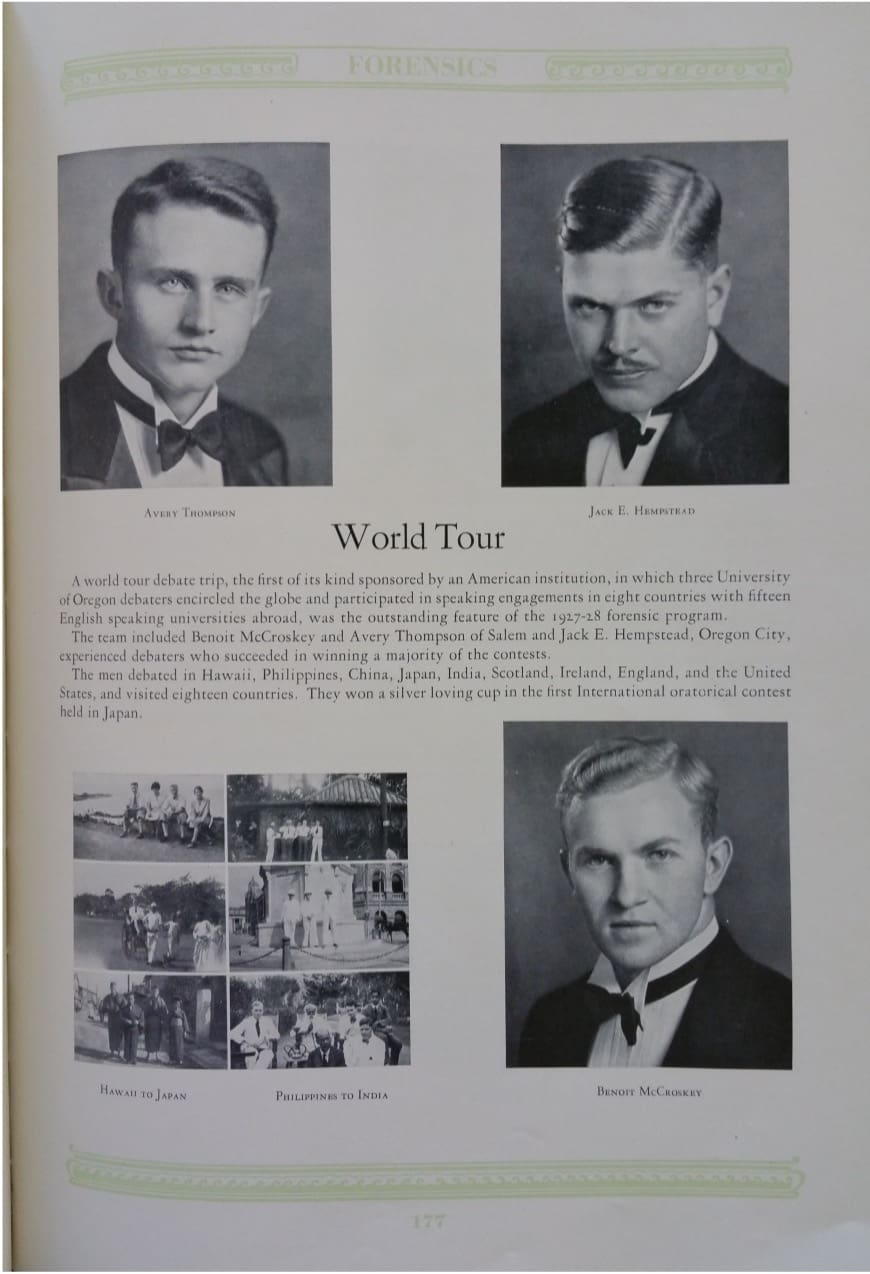 The pinnacle of this era was the World Debate Tour, the first of its kind sponsored by an American university. Three Oregon debaters — Avery Thompson, Jack E. Hempstead, and Benoit McCroskey — embarked on an extraordinary journey that carried them across the globe.