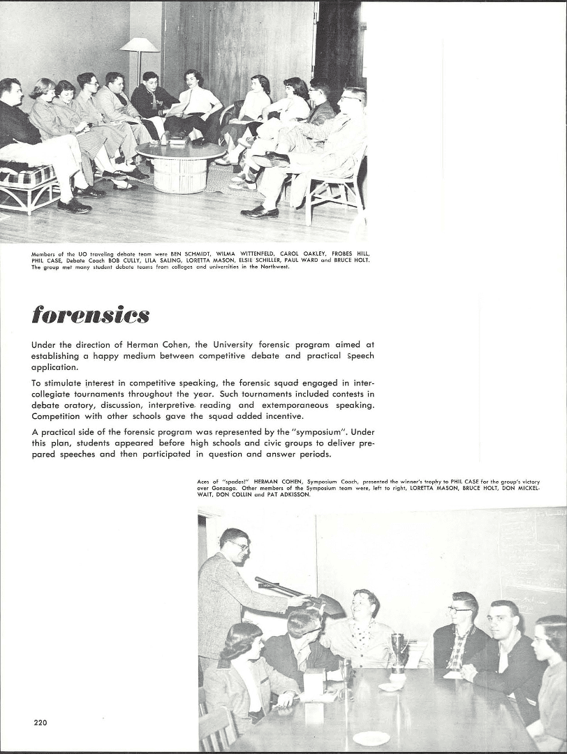 By the early 1950s, Oregon Forensics was reshaped under the leadership of Professor Herman Cohen. Cohen sought to establish a balance between competitive debate and practical speech application, ensuring that Oregon’s program remained both nationally competitive and socially relevant.